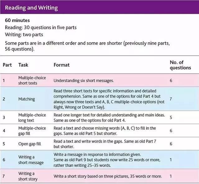 新版KET將舊版考試中該模塊的9部分56道題劍少到7部分32道題,考試時間從70分鐘壓縮到60分鐘;為了全面考察考生在讀寫方面的各項(xiàng)技能與微技能,閱讀材料更加傾向?qū)嵱妙愵}材,內(nèi)容深度有所增加;寫作不僅增加了一篇看圖寫故事,而且兩篇寫作均不再設(shè)字?jǐn)?shù)上限,為優(yōu)秀的考生提供了更大的發(fā)揮空間。