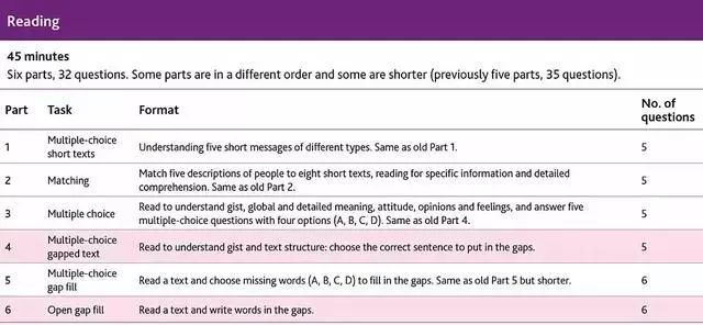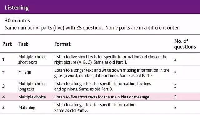 變化最大的是Part 4為新增題型,要求考生理解5段內(nèi)容的主旨思想或觀點(diǎn)態(tài)度,幫助考生開始適應(yīng)PET、FCE的考察方向;此外,Part 3關(guān)于對話信息的考察也從舊版關(guān)注回答轉(zhuǎn)向關(guān)注問答雙方。